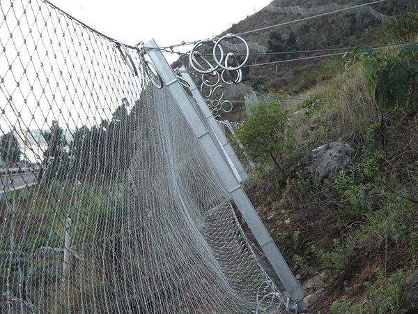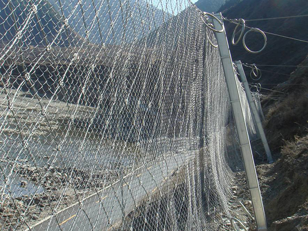 材質(zhì):鋼絲繩網(wǎng)、支撐繩和減壓環(huán)構(gòu)造:由鋼絲繩網(wǎng)或環(huán)形網(wǎng)(需攔截小塊落石時(shí)附加一層鐵絲格柵)、固定系統(tǒng)(錨桿、攔錨繩、基座和支撐繩)、減壓環(huán)和鋼柱四個(gè)主要部分構(gòu)成。
