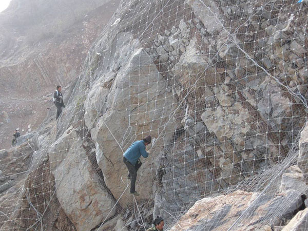 邊坡防護(hù)網(wǎng)有主動防護(hù)與被動防護(hù),主動防護(hù)系統(tǒng)是以鋼絲繩網(wǎng)為主的各類柔性網(wǎng)覆蓋包裹在所需防護(hù)斜坡或巖石上,以限制坡面巖石土體的風(fēng)化剝落或破壞以及為巖崩塌(加固作用),或?qū)⒙涫刂朴谝欢ǚ秶鷥?nèi)運動(圍護(hù)作用)。被動防護(hù)是由鋼絲繩網(wǎng)、環(huán)形網(wǎng)、(需攔截小塊落石時附加一層鐵絲格柵)、固定系統(tǒng)(錨桿、拉錨繩、基座和支撐繩)減壓環(huán)和鋼柱四個主要部分構(gòu)成。鋼柱和鋼絲繩網(wǎng)連接組合構(gòu)成一個整體,對所防護(hù)的區(qū)域形成面防護(hù),從而阻止崩塌巖石土體的下墜,起到邊坡防護(hù)作用。