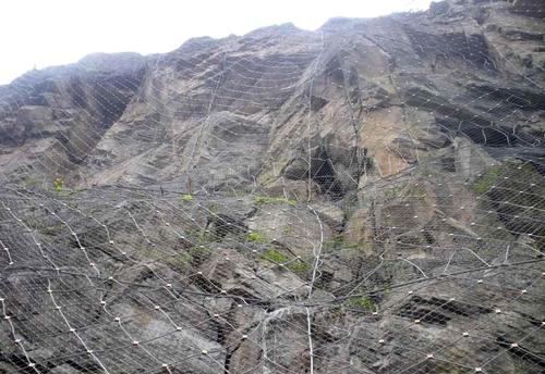 是一種完成兩根鋼絲繩穿插節(jié)點(diǎn)緊固的特別扣件,其對(duì)鋼絲繩施加一定的荷載,避免節(jié)點(diǎn)處鋼絲繩產(chǎn)生錯(cuò)動(dòng)和別離,選用柔性網(wǎng)進(jìn)行坡面防護(hù)的特點(diǎn)在于使用局部受力、整體承載的柔性優(yōu)勢(shì)對(duì)淺、表層危巖體(危石)進(jìn)行圍護(hù),限制落石運(yùn)動(dòng)范圍,部分按捺崩塌的產(chǎn)生。